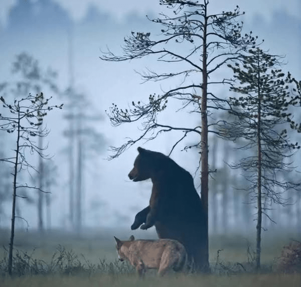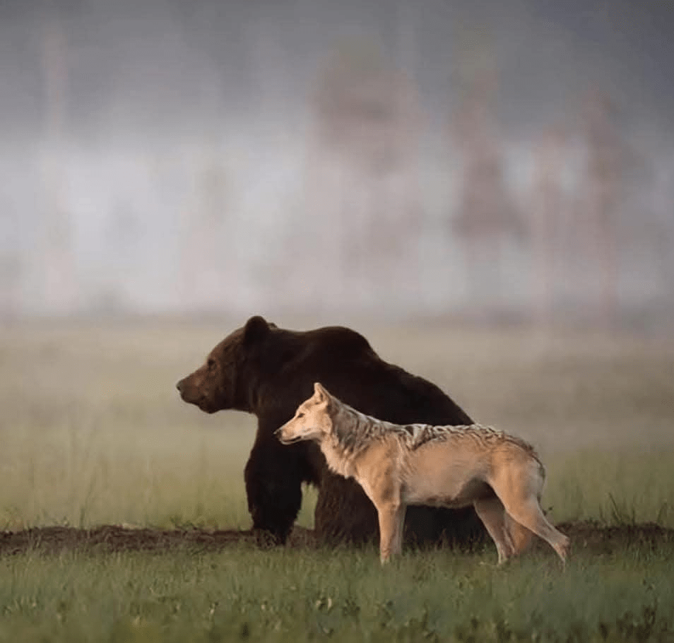 El escritor y fotógrafo finlandés Lassi Rautiainen es pionero en Finlandia en el campo del turismo fotográfico salvaje. Sus primeras fotografías fueron de osos en 1978, para posteriormente captar con su cámara a lobos y lobeznos salvajes. Hace unos años, sorprendió al mundo con un conjunto de imágenes tomadas en un rincón salvaje de su país que mostraban una escena a primera vista imposible: una hembra de lobo gris y un oso pardo macho que pasaron días y noches enteros durante diez jornadas compartiendo caza, comida y compañía en los bosques de Kuhmo, Finlandia.