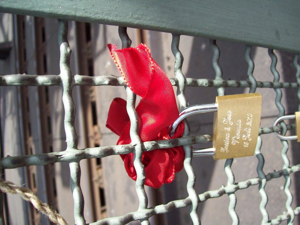 Cualquier país europeo puede ser el origen de esta foto. Un candado de amor es un candado colocado en un puente, cerca, puerta, o accesorio público, significativo para una pareja enamorada, para simbolizar su amor. En general se escriben sobre el candado los nombres o iniciales de los integrantes de la pareja, y una vez cerrado el candado, se tira la llave para simbolizar el amor inquebrantable. Desde la década de 2000, los candados de amor han proliferado en varios lugares alrededor del mundo. Con frecuencia son tratados como basura o acto de vandalismo por las autoridades municipales, ya que existe algún costo para su eliminación.