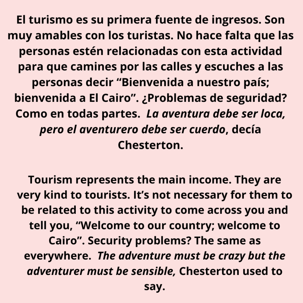 Los vendedores del lugar, tan característicos del mundo árabe, merecen un comentario aparte. Son respetuosos en su trato pero insisten. Cuando descubren que hablás español, te dicen «Hola, hola, Coca Cola». Poco después descubrís que uno de sus camellos se llama Antonio Banderas y otro Ricky Martin. La globalización tiene sus ventajas y desventajas. Te invitan además al juego del regateo. No podés escapar a esa situación porque ante tu primer «no», la pregunta es «¿Cuánto querés pagar?» Puede resultar difícil si nunca lo hiciste, no te animás al principio, pero al fin y al cabo, es tan parte de la cultura como tomar café árabe o comer baklava. ¿Qué pasa en general? Terminás pagando mucho menos del precio original, lo cual te hace sentir contenta porque creés haber aprendido rápido. En realidad, ese precio final es el precio original. En fin, es parte del juego y lo terminás aceptando porque forma parte del folklore del lugar. Pero, y quiero insistir en esto, son respetuosos. Alguno hasta te regala un amuleto para que, según sus creencias, estés protegida en tu vida.